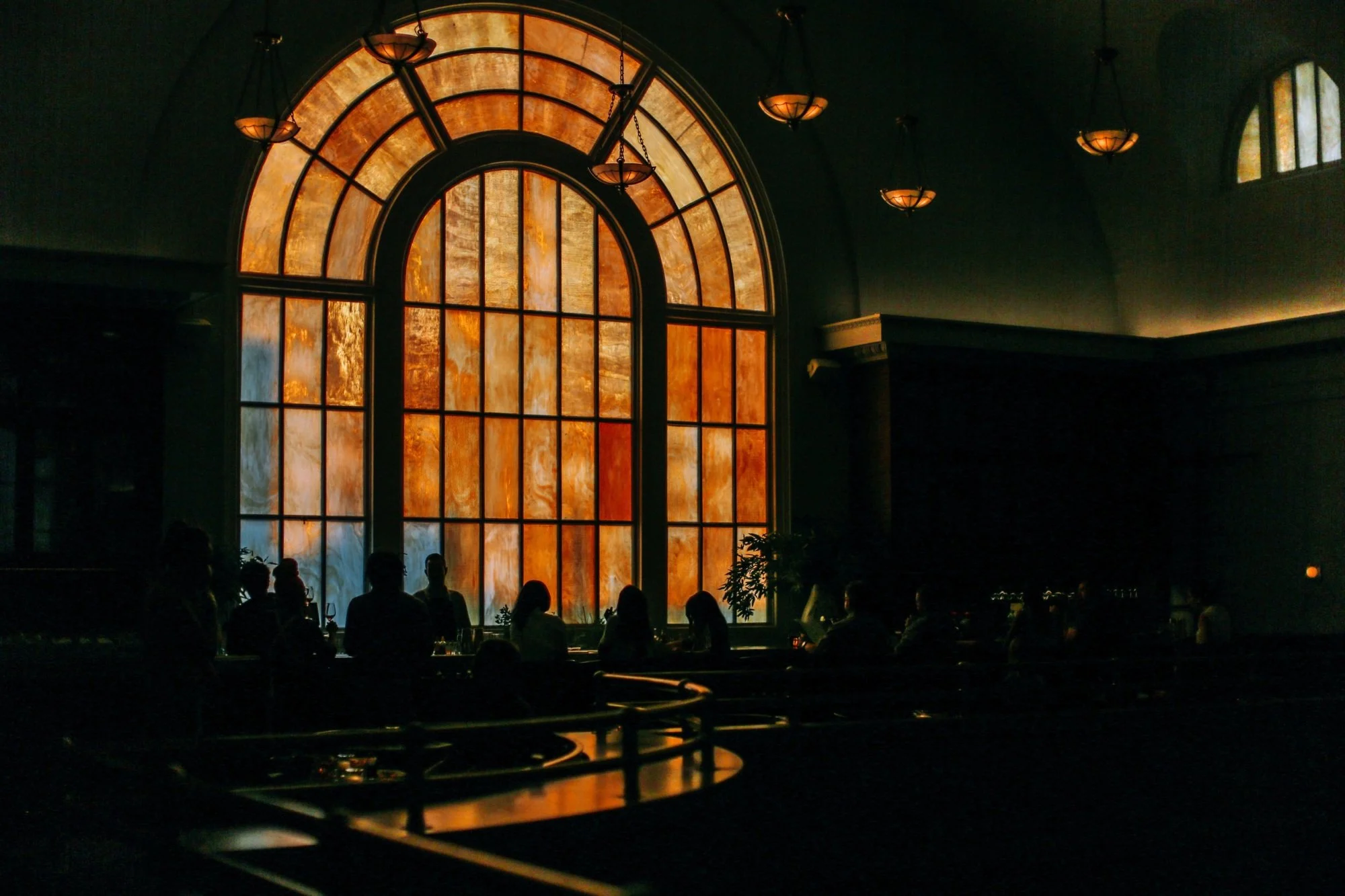 Inside Look: A Cathedral-like Milk Glass Window Sets a Dramatic Tone at A Rake’s Bar